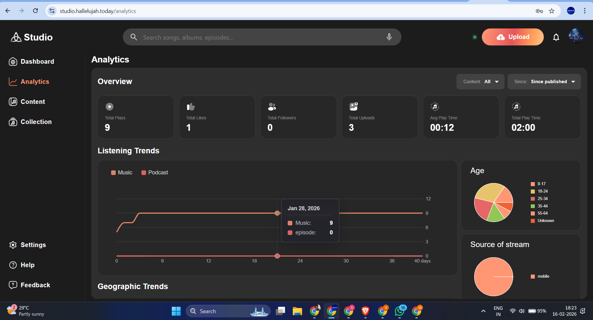 Get detailed analytics on plays, playtime, trends, audience age, and streaming sources.