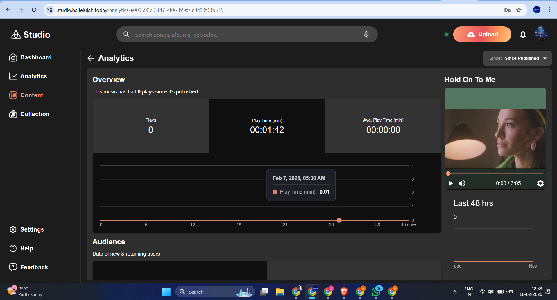 Track each song or episode performance with playtime charts and last 48-hour activity.