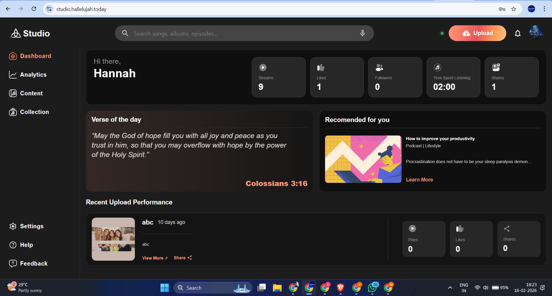Faith-Driven Recommendation Engine Our system does not chase trends — it understands spiritual rhythms, worship habits, and devotional patterns. It recommends content that strengthens faith, not distraction. Premium Worship-Grade Audio Every track is delivered with studio-level precision. We are building a dedicated audio enhancement process to ensure clarity, excellence, and consistency worthy of the message. Structured Faith-Centric Categories From worship to youth teaching, devotionals to apologetics — content is organized intentionally. This improves discovery for listeners and growth for creators through Hallelujah Studio. Creator-First Model Hallelujah is designed not just for consumption — but for ministry sustainability.